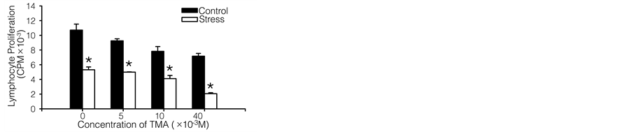 Figure 4 showed the effects of 3 K+ channel blockers―quinine, 4-AP and TEA―on B lymphocyte proliferation stimulated by LPS in control and stressed mice. The 3 blockers reduced the difference in proliferation between the two groups in a dose dependent manner (Figures 4(a)-(c)). But the negative control, TMA, had no effect on B cell proliferation (Figure 4(d)). Similar with what was found in T cells, the difference in B cell proliferation decreased between control and stressed mice with increasing blocker concentrations (Figure 4(e)). As assessed by trypan blue dye exclusion, quinine, 4AP, TEA or TMA did not affect the viability of B cells (Table 1).