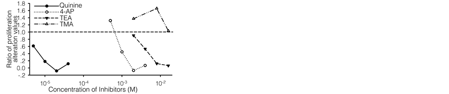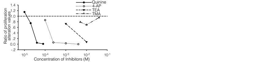Quinine, 4-AP, TEA and TMA were respectively added into the cultures to examine the effects of K+ channel blockers on T or B lymphocyte proliferation.