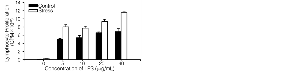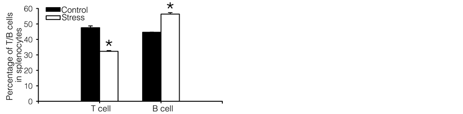 lymphocyte mitogenesis, cell number and NK cell activity are greatly suppressed by the stress [11] [29] . However, how resistant stress affects B cell function is only starting to be explored at present. Different groups have employed various animal models and stress periods, but their conclusions are conflicting [30] [31] . The findings presented in this study support the viewpoint that restraint stress inhibits T lymphocyte proliferation stimulated by Con A (Figure 1(a)) and enhances B lymphocyte proliferation stimulated by LPS (Figure 1(b)). Based on our previous work [9] [12] , which demonstrates the inhibition of T lymphocyte proliferation in stressed mice, we show here for the first time that restraint stress causes different changes in T and B cell proliferation in the same mouse. Under restraint stress, T cell function is decreased, whereas B cell function is enhanced. The stress can either enhance or suppress immune functions depending on a variety of factors. Chronic stress has been demonstrated to exert a significant suppressive effect on immune function. The mechanisms by which restraint stress adversely affects humoral immunity in the present study need to be investigated further. The latter may be a compensatory regulation to balance the immune function.