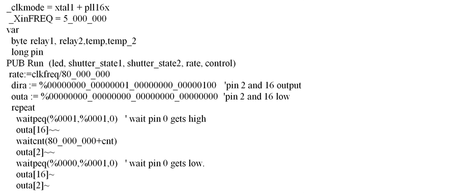 The required parameter in this application is the timing between the acquisition and the operation of the diaphragm. Even in this case, programming the chip is not a straightforward action. The program required for this action is presented in Figure 2 and is to be compared to the program written for the Propeller presented later.