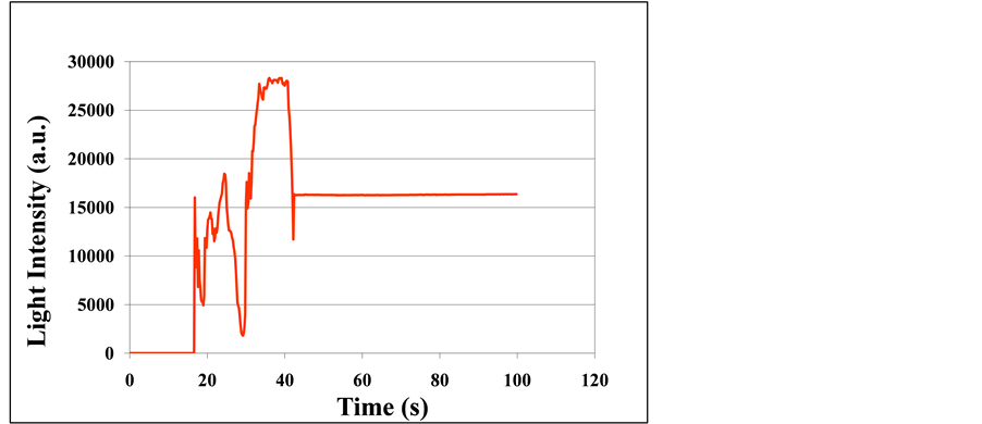 Another application of the circuitry of Figure 5 is the control of the stability of a small laser (a diode pumped solid state laser―DPSS laser) emitting a green light at 532 nm. The result of the measurement, shown in Figure 9, indicated that, at start up, the laser intensity is very unstable. Afterwards, the output signal is much smaller.