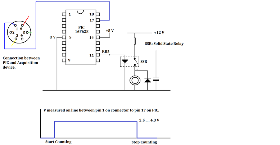 These devices are very small and very cheap 8-bit MCU [1] . They are programmed in assembly language which is very difficult to use for a neophyte even for the basic commands. They can be used for simple commands such as diaphragm controls, but more complex applications such as data acquisition require a real skill to program these devices. It is not recommended for a scientist not specialized in MCU digital electronics. Figure 1 shows an example of application of the 16F628 for the control of an electrical diaphragm in a device developed for OSL dosimetry. When the acquisition sequence is initiated, the measurement device (here a photomultiplier module from SENS TECH inc.) sends a positive signal to the MCU. This one waits for 0.5 second and send a small current to an opto-coupler which orders the diaphragm to open. When the acquisition is finished, the signal goes to zero and the MCU closes immediately the diaphragm.