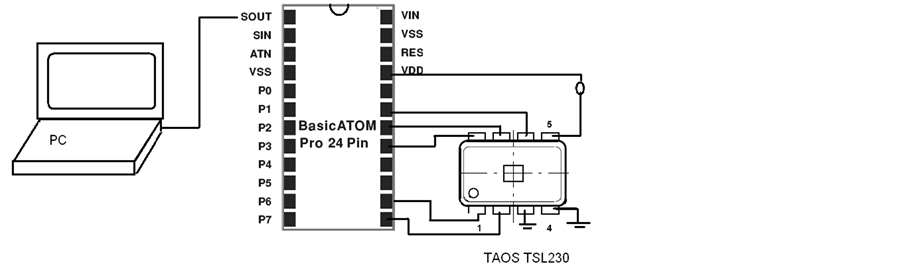Figure 3. High resolution measurement of light intensity with a basic atom and a TSL230 light-to-frequency converter.