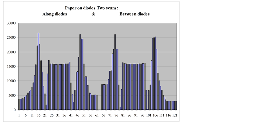 This card is used in the Apollo Framework to control the intensity of an L.E.D. to read dosimeter crystals. The advantage of this card is that it can be programmed with different programming languages (Delphi, Visual Basic, …) and that the program can be easily modified by the user for special purposes. In the case of the present study, where the light intensity is to be controlled, an LDR, connected to an analog input of the USB card, is placed near to the L.E.D. The Figure 10 hereafter shows the evolution of the light intensity while modifying the position of the LDR in the vicinity of the L.E.D. In this case the resolution of the measurement is better than 1% (8-bit counting) is lower than the resolution of the mounting presented in Figure 5 with the TAOS (32-bit), but is enough for the purpose of this experiment. The card acquires two measurements (adjustable value) of light intensity per second and the graph in the figure shows 2000 consecutive counting values, but the results of the full measurement have practically no limit and is stored in a special file for further analysis after the measurement.