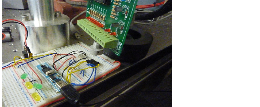 A first application of the propeller is the measurement of the transmittance of Al2O3:C crystals (Figure 5). This measurement requires a stable light source and a measurement of this source intensity. An L.E.D. is powered by a USB card (the green card on the figure which will be described later) which generates a constant current intensity. This L.E.D. is placed at 1 centimeter in front of a TSL230 light to frequency converter whose frequency is measured by a first cog of the propeller (the blue print on the breadboard in Figure 5). The TSL230 is covered