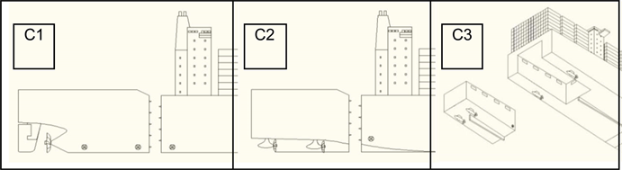 In Figure 1 and Figure 2: Concept 1 complicated taking a conventional containership and separating it into two parts while keeping the same hullform. The aft end of the vessel converts the propulsion unit and the remains of the ship is the cargo unit.