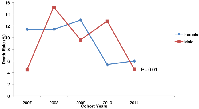 Figure 1 shows that males had a trend to be more likely to experience death than females as an outcome (RR = 1.03, 95% CI = 0.68 - 1.56). In terms of outcome by place of residence, the 2007 cohort showed that two (6.7%) and nine (8.9%) in 2007, zero 0% and 22 (14%) in 2008, four (6.9%) and 17 (12.4%) in 2009, six (8.6%) and 21 (10.3%) in 2010 and four (3.1%) and 13 (6.9%) in 2011, rural and urban residents died respectively. Therefore across the five cohorts, urban residents had a trend of more likely to die, compared to their rural counterparts (p = 0.010).