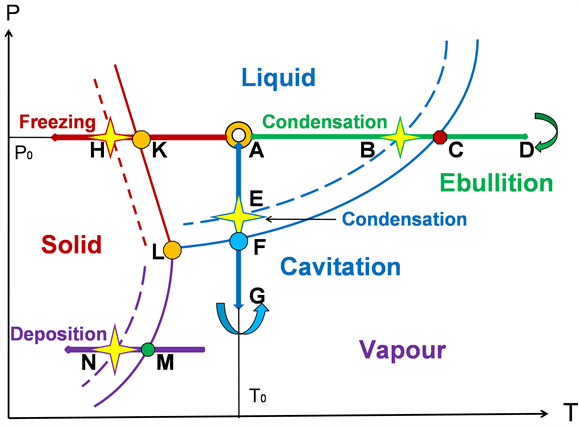 Then the description of the VBL phenomenon follows: Let us consider a very small volume of liquid at temperature T0 and pressure P0 which correspond to the figurative point A in the phase diagram (Figure 3).