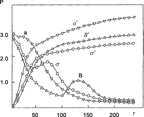 Figure 4. Integral flux P (10−3 W cm−2) of IR radiation versus time τ (seconds) from the sample surface during the melting and crystallization of STSP under changing cooling and heating conditions: a (∇) and a' (∇) is cooling and heating between 7 and 63˚C, σ (ᴑ) and σ' (ᴑ) is cooling and heating between 13 and 60˚C, B' (Δ)―heating to 61˚C, B (Δ)―cooling with supercooling of the melt on 15˚C.