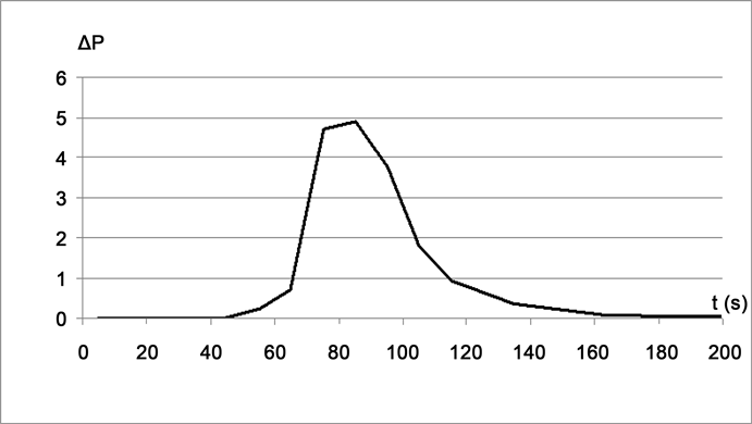 To clarify a shape of the infrared peak, differential measurements were carried out. For this, two identical cuvettes with STSP substances were used, but a surface of the specimen in one of the cuvettes was covered with a thin blackened copper foil. Both specimens were melted and crystallized in the same regime identical to the curve B (Figure 4). The integral flow of the blackened specimen was subtracted from the integral flow of the ordinary specimen. Time dependence of a resulting differential flow δP is presented on Figure 5. It is interesting