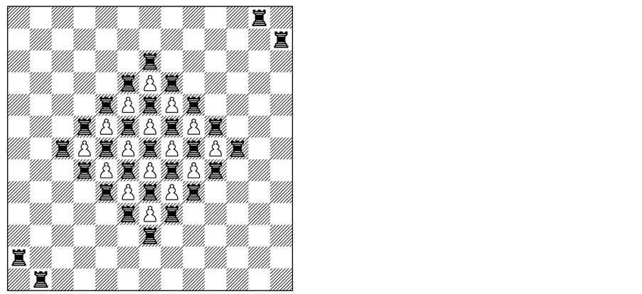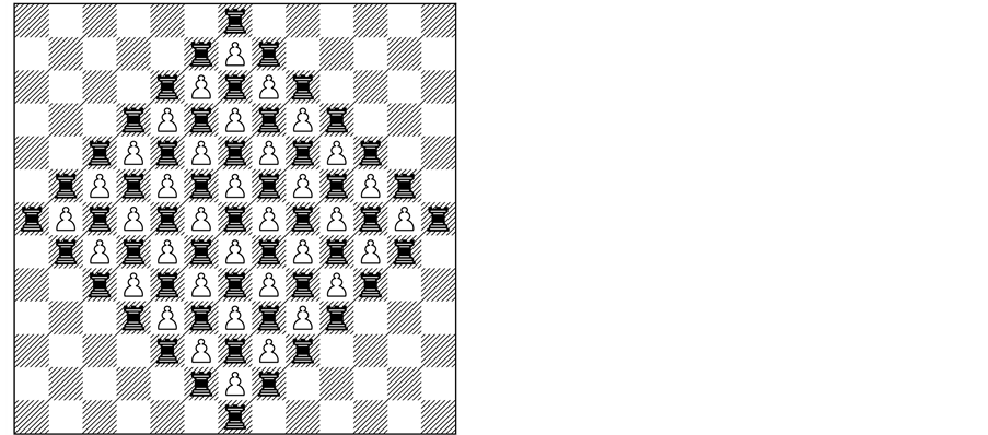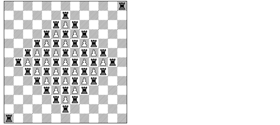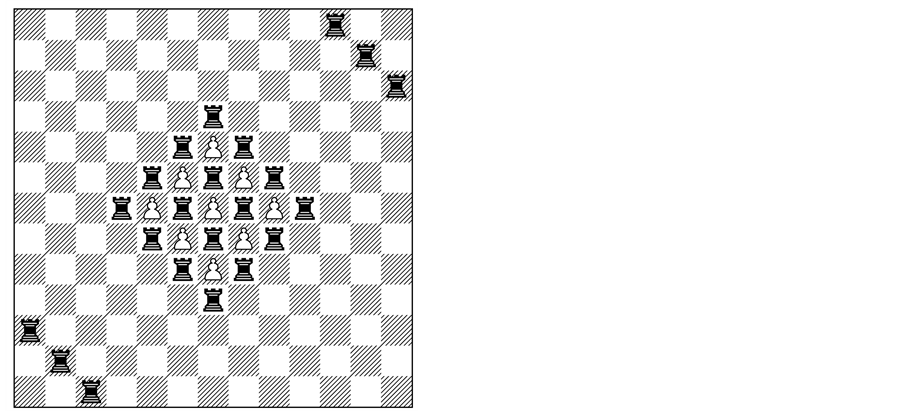 Figure 3. This formation of rooks and separating pawns is placed in the 2-D slice that one unit above the 2-D slice corresponding to Figure 2, while the reflection of Figure 3 is placed one unit below the reflection of Figure 2.