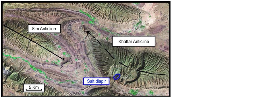Dominant structural trends in Zagros Mountain (Figure 1) are NW-SE in northwestern part and E-W in south- eastern part. From tectonics point of view, it contains the overthrusted and simple folded belts of Zagros that formed on the northeastern part of Arabian plate’s passive margin. Zagros is external platform (folded and thrusted belt) of north margin of Arabian Craton. Vergence of folding in this zone is toward south and southwest. Hormuz Salt had been deposited within main sub-basins of Zagros basin in Late Precambrian-Early Cambrian. The Hormuz formation is formed by salt, anhydrite, black dolomite, shale, red siltstone and sandstone and volcanic rocks. The most of 107 emergent salt structures are related to central and eastern part Zagros. The Hormuz and equivalent series were deposited in an Evaporite basin during the late Precambrian-early Cambrian [5] . Coeval salt basins crop out in a large domain including the Central Iran as Ravar series [6] .