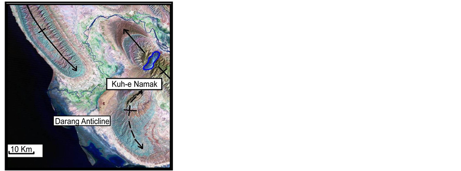 Figure 6. Interpreted ETM+ satellite image of Kuh-e Namak salt glacier (blue color) and Darang Anticline (a diapiric fold) at south of Shiraz-Kazerun pro- vince. Map located in Figure 1.