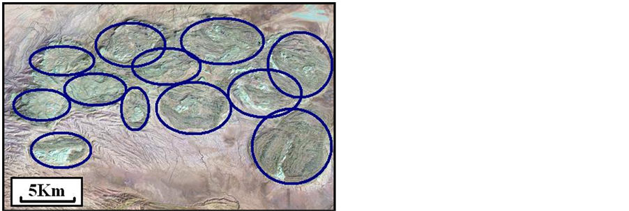 Figure 9. Interpreted ETM+ satellite image of 12 side-by-side salt diapirs (blue color) at south of Semnan. Map located in Figure 1.