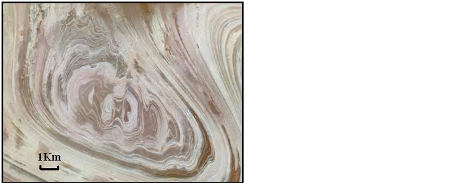 At this province, more than 50 salt domes are emergent. Erosion has resulted in the formation of 12 side-by- side diapirs (Figure 9), whose their appearance is similar to that of a canopy. The salts of this region are of old and new types. So the diapirism of this area can be assumed to have two separate origins. Also, a typical Crescentic folds (Figure 10) and a Vortex mushroom diaper (Figure 11) has been appeared in Great Kavir province.