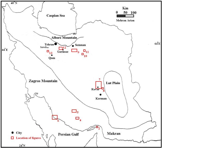 Great Kavir province (Figure 3), at south of Semnan can be considered as the most extensive salt basin of Central Iran. Because, based on the previous studies, such as [23] and [24] , there are old and new type salt diapirs. Now we encounter penetration of interrelated diapirs with old and new salts―side by side or inside each other.