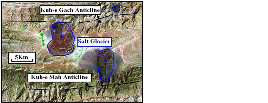 Garmsar province (Figure 3) belongs to depression of northwestern margin of Great Kavir. The salts of this province are of old type, in which presence of salt, gypsum and sulfur reserves has been resulted in increase of mining activities at this area. The origin of Garmsar region salt domes are distinguished as Lower Red formation and external trigger have confirmed by stretch shape of salt dome. There is a salt-tongue canopy with 130 km2 areas that introduced as the biggest salt glacier in Iran (Figure 12) in front of an active region or Central Alborz [25] - [27] .