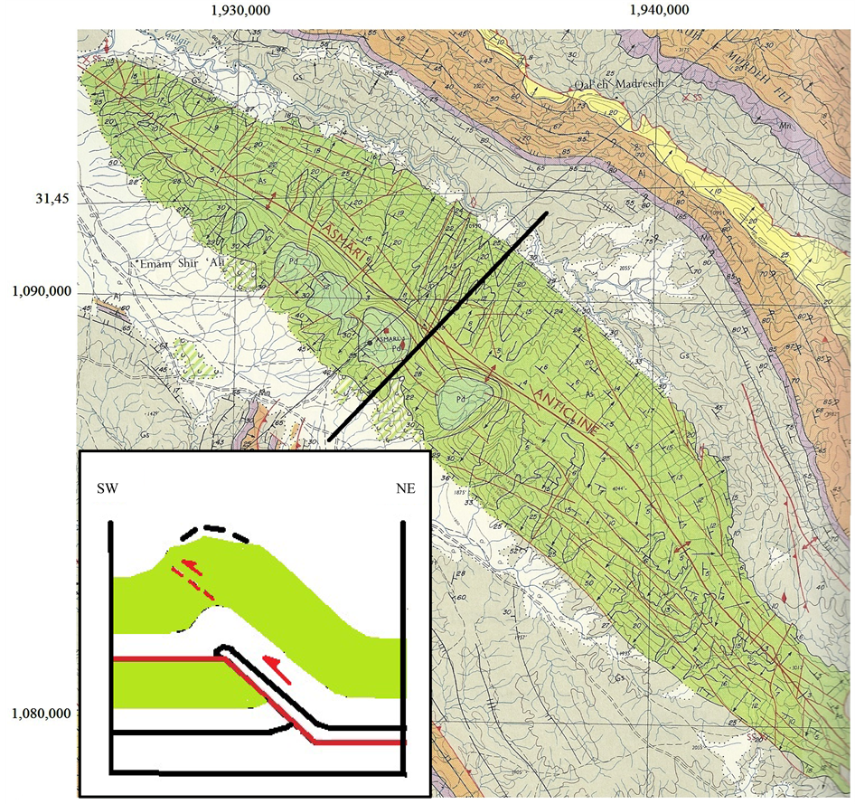 Figure 8. Geologic map of Asmari anticline with a cross section line (black line), modified from [6] and a schematic cross section of Asmari anticline, based on [7] . Post-Cretaceous sequences (Khami-Quaternary) are in green color.