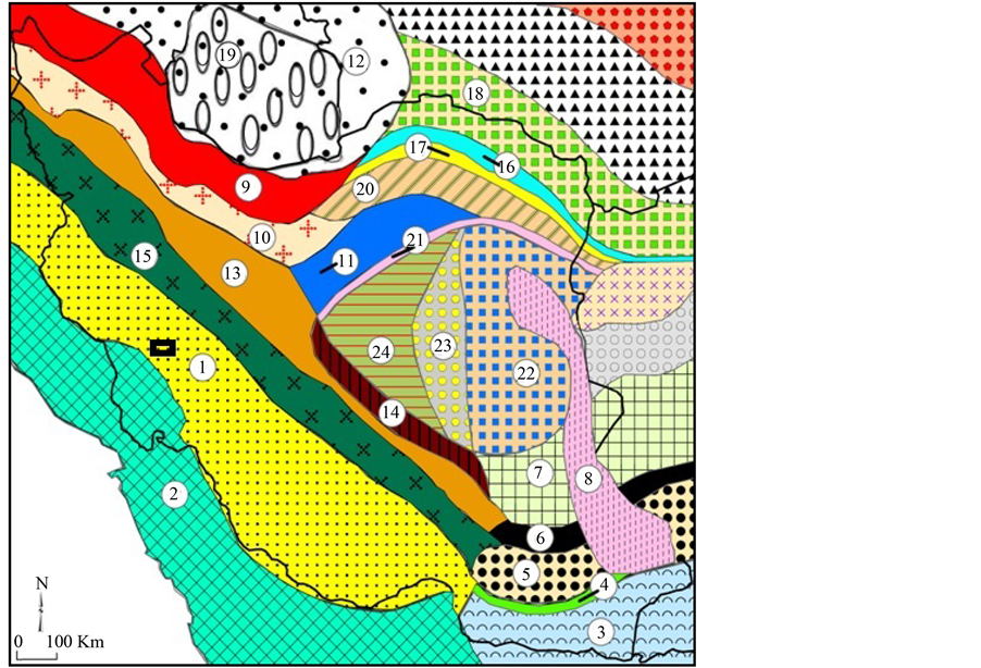 Figure 1. Physiographic-tectonic zoning map of Iran’s sedimentary basins Iran modified from [1] . Numbers in this figure are 1: Zagros-East Taurus hinterland; 2: Persian Gulf-Mesopotamian foreland basin; 3: Makran accretionary prism; 4: Bashagard Mountains; 5: Jazmorian-Mashkel fore arc basin; 6: Shahsavaran-Soltan magmatic arc; 7: South Lut-South Helmand back arc basin; 8: East Iran Mountain belt; 9: West-Central Alborz and lesser Caucasus hinterland; 10: Great Kavir-Nor- then Urmieh lake foreland basin; 11: South Great Kavirfold and thrust belt; 12: South Caspian-Black sea foreland basin; 13: Urmieh-Dokhtar Magmatic arc; 14: Naien-Kerman retro arc foreland basin; 15: Sanandaj-Sirjanoverthrust belts; 16: East Alborz or Binalod hinterland; 17: Torbat-e am-Neyshabour retro arc foreland basin; 18: KopetDagh hinterland; 19: South Caspian remnant basin; 20: Maiamay- Taibad Inverted back arc basin; 21: Khaf-Kavir Plain Magmatic arc; 22: Lut Plain- Gonabad back arc basin; 23: Tabas hinterland; 24:Yazd-Khour Piggy back basin. The study area is shown in the black rectangle.