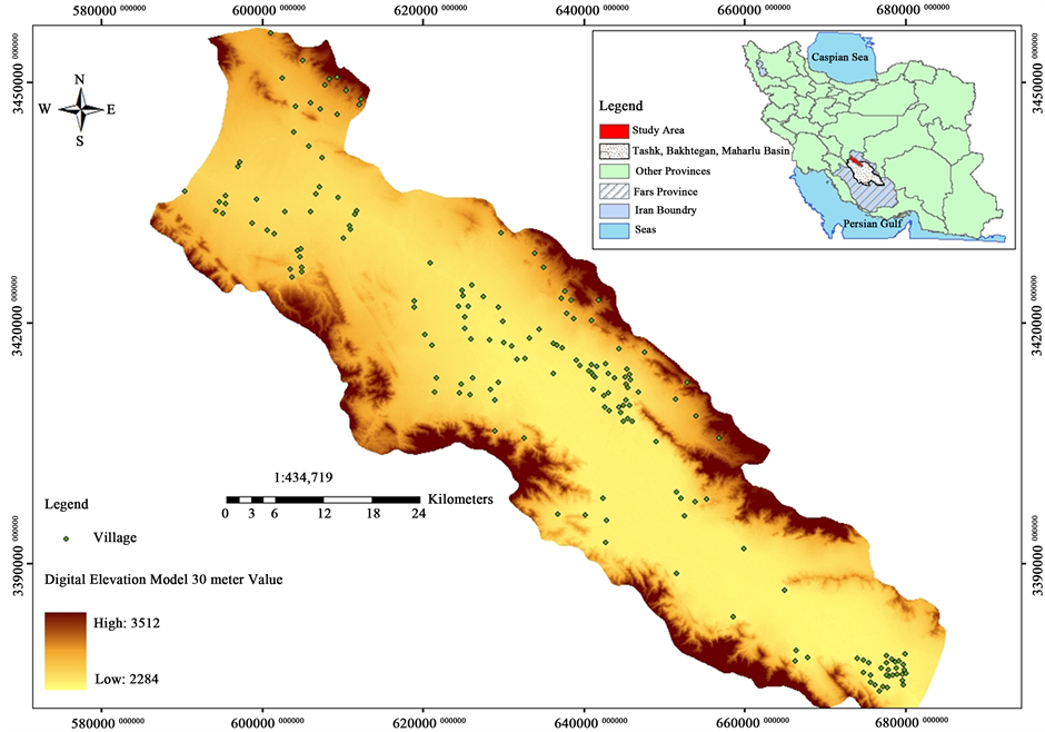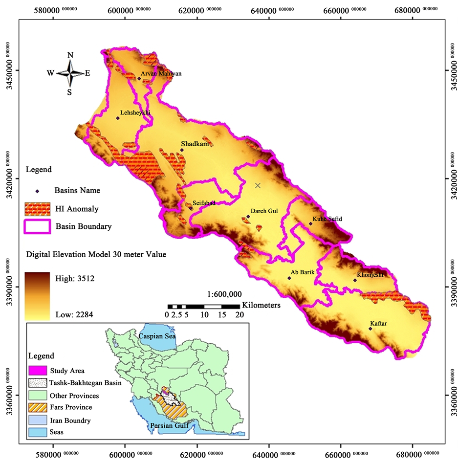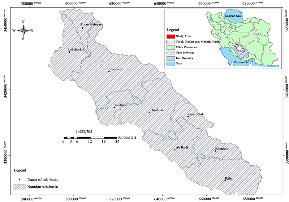 The study area is about 304,000 hectare in the terminal zone of the high Zagros belt in Fars Province, southwest Iran. Major rock groups are Bakhtiari, Asmari, Jahrom, Fahliyan, Daryan, Khanehkat, and Neyriz (Figure 2). Central point of Namdan basin is located at longitudes 52˚42'E and latitude 30˚55'N. Average altitude of it is various from 3370 meter at Mountains to 2200 meter at low terrains from open seas level.