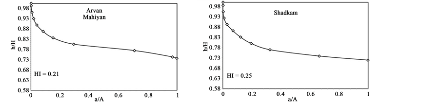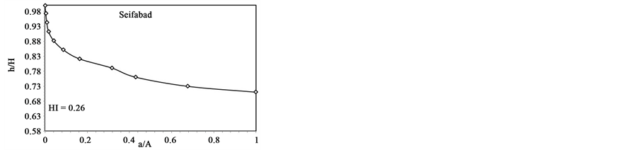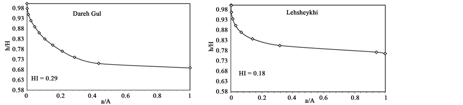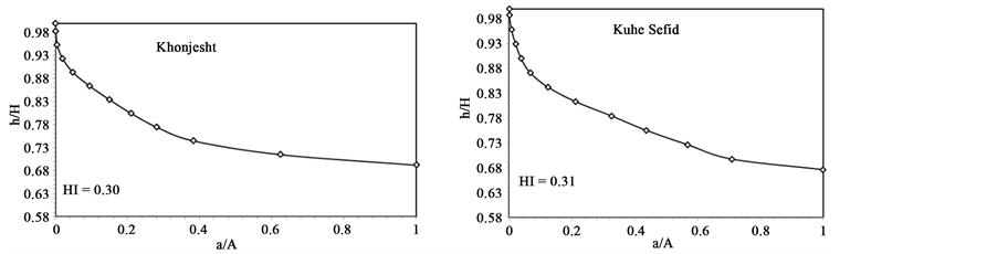 The hypsometric integral value ranges from 0.18 (sub-basin Lahsheykhi) to 0.31 (sub-basin KuheSefid). The hypsometric curve and the hypsometric integral are valuable tools in characterizing topography because they are correlated with the stages of geomorphic development of the landscape [16] . The values of elevation necessary for the calculation are obtained from a Digital Elevation Model. The average elevation is from 50 points of elevation taken at random from the drainage basin. The hypsometric curve represents the relative proportion of area below (or above) a given height (Figure 5).