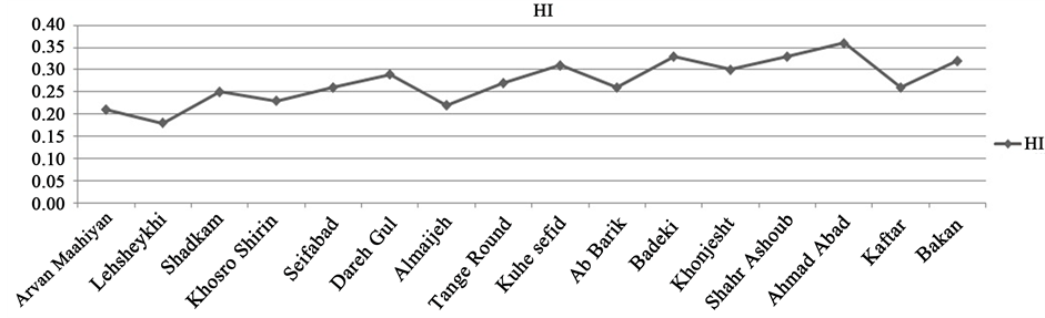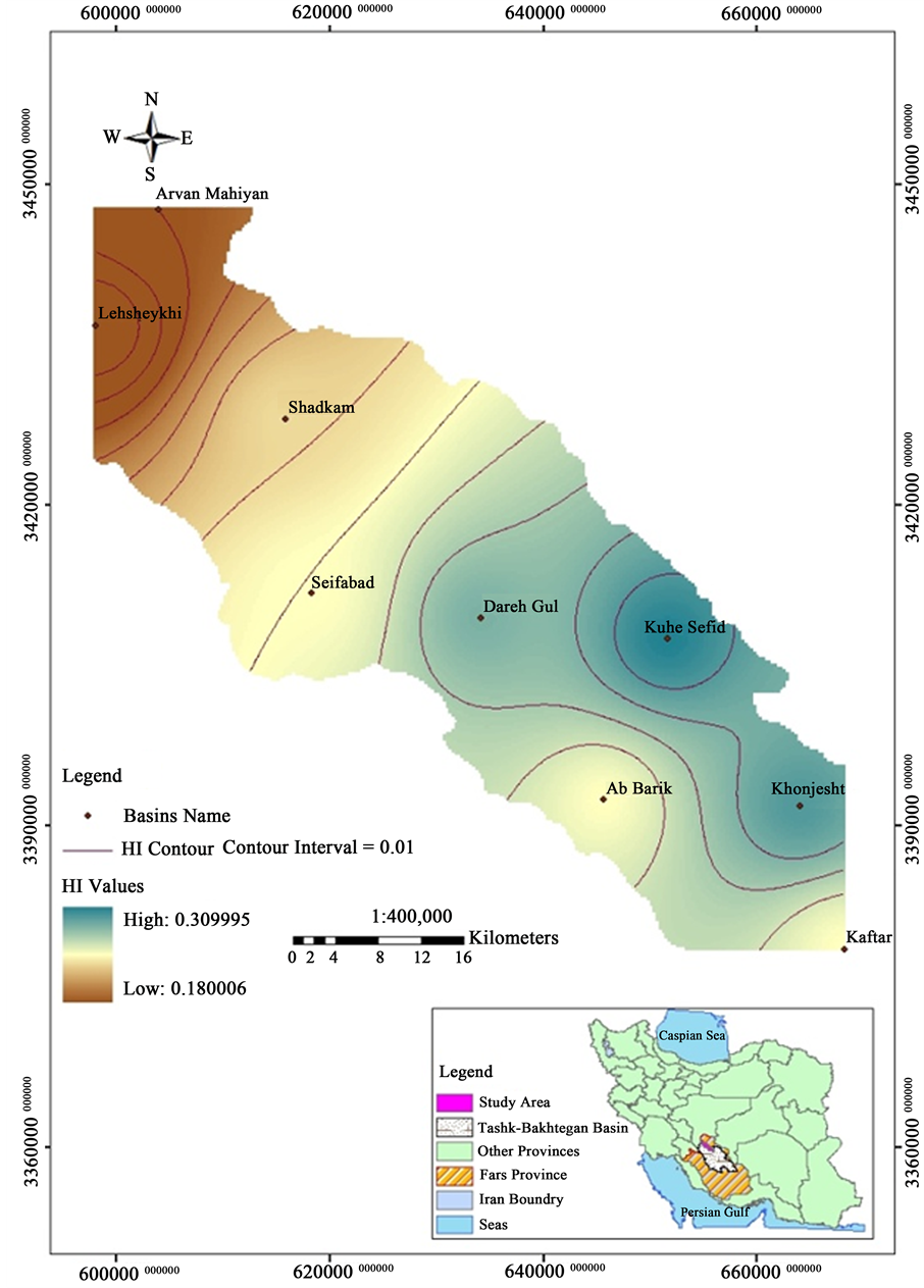 HI value is 0.258.Then, HI value (Figure 7) was contoured (Figure 6) by spatial analyst extension and the hypsometric integral value map of Namdan basin has been used as a base map. It shows Hi changes are equal in all of parts of Namdan basin.
