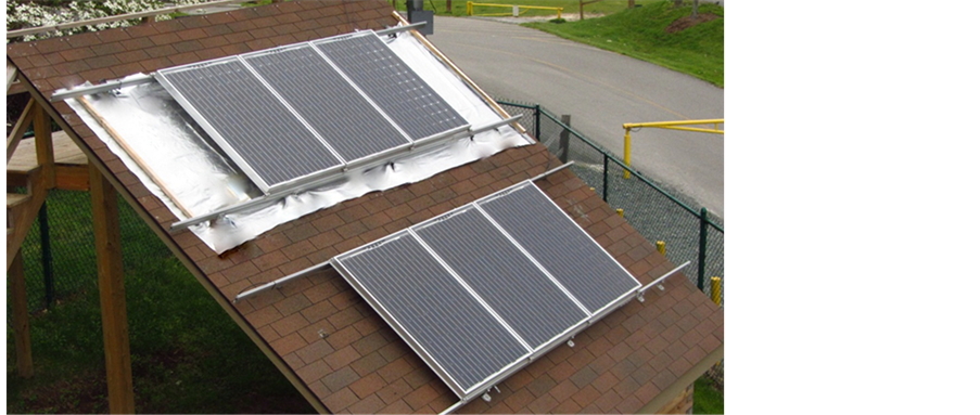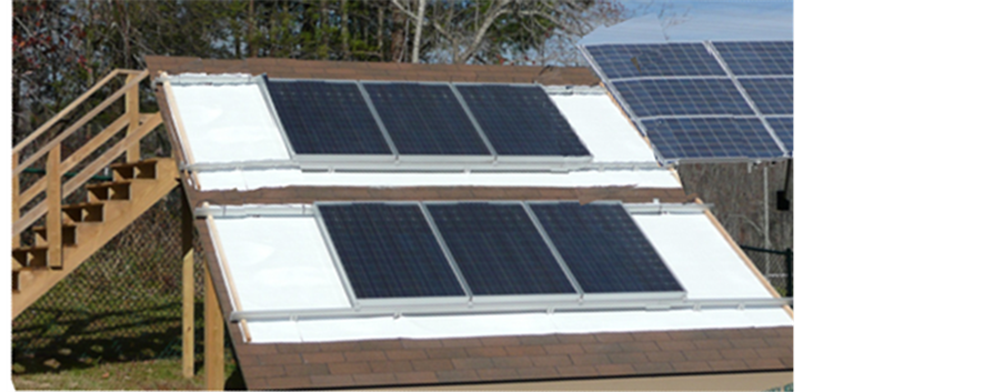 Two case studies highlighted by Sanyo include the successful home, lumenHaus, built by Virginia Tech that won the Solar Decathlon 2010 in Europe, and a solar canopy installation on an office building in Atlanta. What is not stated in either of the two case studies is what material was used below the modules for the lumenHaus or for the surface below the canopy of the Atlanta office building [13] . DuROCKAlfacing International Manufacturing Company in Woodbridge, Ontario has mounted a 10 kW array of HIT 195 Double Modules at a 30˚ angle on their flat roof (Figure 3). The reflective material used below the modules was TIOCOAT™, a white protective roofing material. The bifacial modules as reported produced between 195 W and 210 W [14] .
