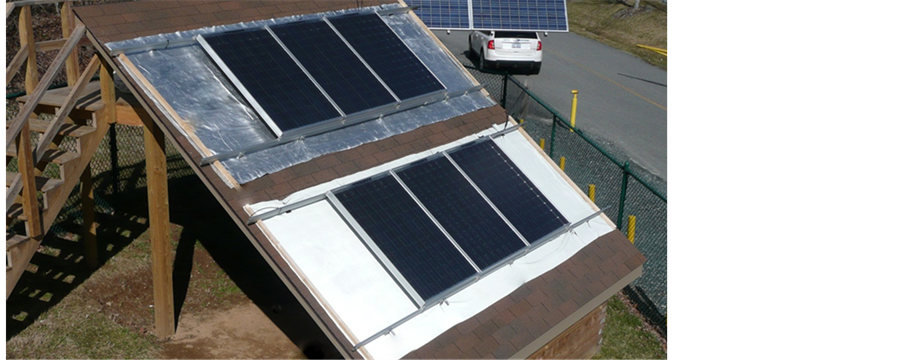 The modules were placed on a 36˚ angle mock roof. Two arrays were mounted horizontally in a series with a positive terminal on the left of the array, and a negative terminal on the right. The two arrays were placed horizontally, one above the other, by use of UNIRAC aluminum racking. Each array consisted of three modules wired in series. The adjustable aluminum racking fastened to the mock roof held the modules parallel to the roof’s surface or permitted the horizontal placement of the lower array. Varying reflective materials and geometries were purposefully used under two separate arrays in six trials in the same location for a period of nearly five months.