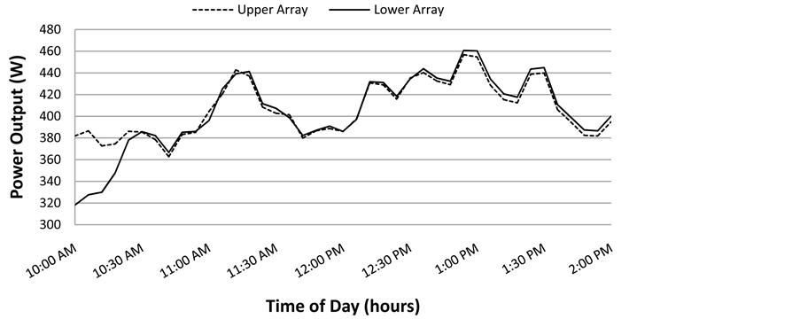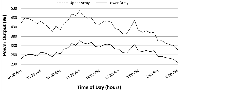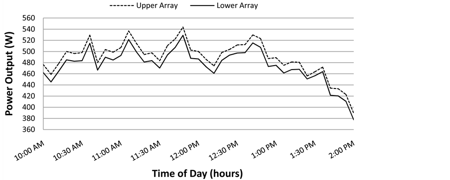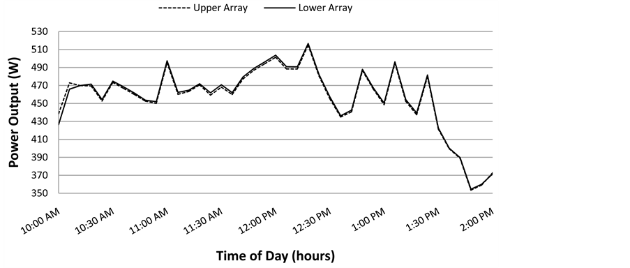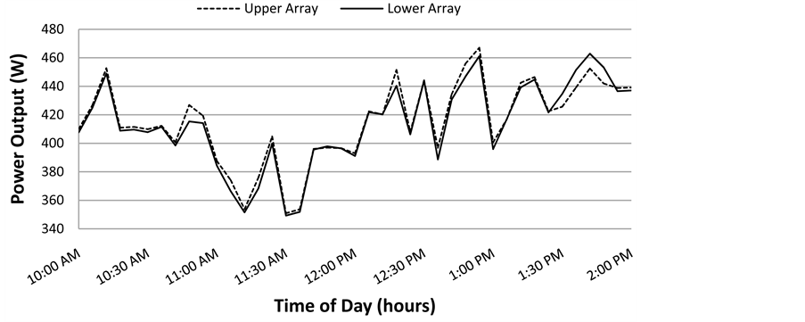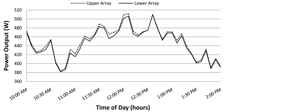 Figure 11 indicates very little power difference with a nearly identical graph for both arrays, where their power outputs varied from 353.53W to 516.61W. Although the lower array consistently performed better than the upper array, the average the power difference between the two arrays (upper-lower) was only −0.24% (s = 1.57%, n = 1963). Using the two additional modules over medium brown shingles to create purposeful shading on either side of the upper array caused little difference in power output.