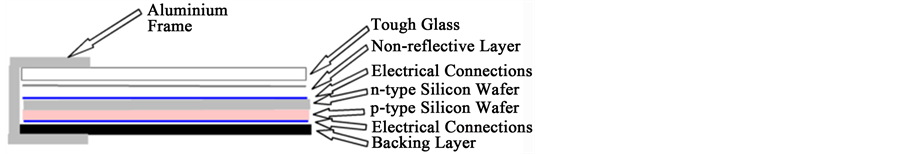 The main element used for a solar module semiconductor is silicon. N-type (free electrons) silicon has had phosphorous added to it while a p-type (electron voids) silicon has had boron added [5] . A conventional solar cell consists of minimal layers: an electrode, glass with an anti-reflective layer, n-type, p-type, crystalline Si, and a metal electrode (Figure 1).