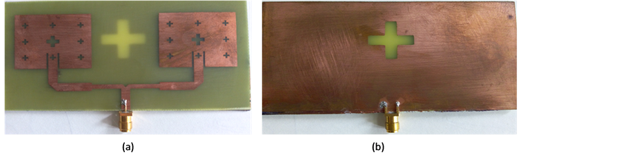 Figure 1(a) represents the geometry of conventional antenna array. In Figure 1(b) one plus shape slot is cut from the centre of both patches to make its similar structure to the 1st iteration of antenna array. In 2nd iteration, eight more plus shape slots are cut from both patches as shown in Figure 1(c). Figure 1(d) represents defected ground back view of PSFAA. Fabricated geometry PSFAA with front and back views are shown in Figure 2(a) and Figure 2(b) respectively. Design parameters of PSFAA are shown in Table 1.