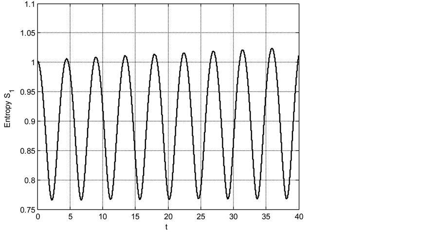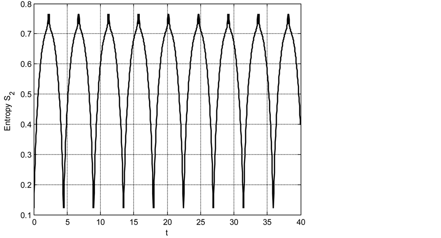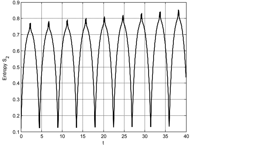 Figure 7. Temporal evolution of the Shannon entropy for the parameters of Figure 6 with