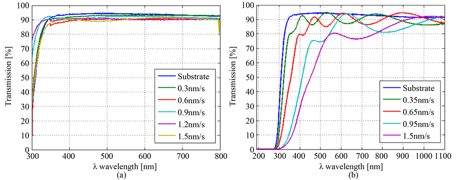Figure 2. Spectral transmittance of SiOx film evaporated under: (a) low vacuum and (b) high vacuum.