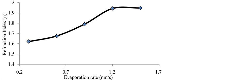 From dispersion curves shown in Figure 5 for SiOx films, it is possible to see a relationship between refractive index of the films and their evaporation rates; refraction index increase as evaporation rate increase. Previous works on the synthesis of SiOx films, have shown a direct relation between the stoichiometry x and the refractive index of the films [7] - [10] .