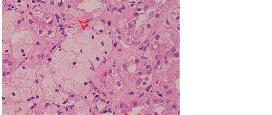 Figure 1. Light microscopy depicted accumulating excessive lipids in renal tubular cells led to extremely foamy appearance and luminal obliteration (arrow). Such fatty change is followed by necrosis of injured cells and detachement from the basement membranes (arrow) compounding luminal obliteration.