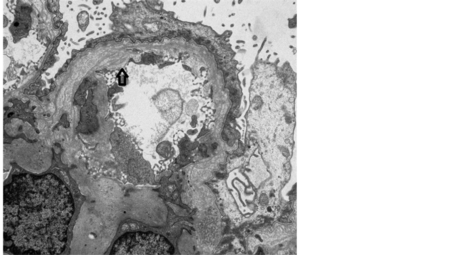Figure 2. Electron microscopy demonstrated irregular distribution of glomerular basement membrane with basket-weave appearance (thinning, thickening, splitting and lamination of lamina densa; arrow), and effacement of podocyte foot processes.