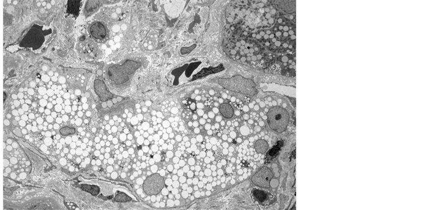A 12-year-old girl presented with puffy face, bilateral lower-leg edema and frothy urine in recent two months. Biochemical studies showed nephrotic range proteinuria, hematuria > 30 erythrocytes per high-power field, lipiduria, serum cholesterol 10.1 mmol/l, albumin 16 g/l, and creatinine 30.5 mmol/l. Her blood pressure was 108/70 mmHg, and renin-angiotensin system blockers were not used. A kidney biopsy was performed for her nephrotic-nephritic syndrome with unclear etiology. Light microscopic examination with hematoxylin and eosin stain revealed rigidity and moderate thickening of the glomerular basement membrane (GBM), and segmental glomerular sclerosis. Accumulating an excessive amount of neutral fats in renal tubular cells led to extremely foamy appearance and luminal obliteration (Figure 1). Such fatty change is followed by necrosis of injured cells and detachement from the basement membranes compounding luminal obliteration. Electron microscopy depicted irregular distribution of GBM with basket-weave appearance (thinning, thickening, splitting and lamination of lamina densa) and diffuse effacement of podocyte foot processes (Figure 2). Myriad intracellular lipid droplets were noted within tubulointerstitial lipid-laden foamy macrophages (Figure 3).