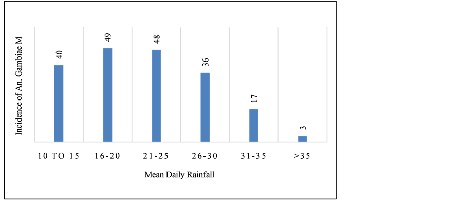 With gambiae M, the highest prevalence ranged between 10 mm and 35 mm mean daily rainfall (Figure 4).