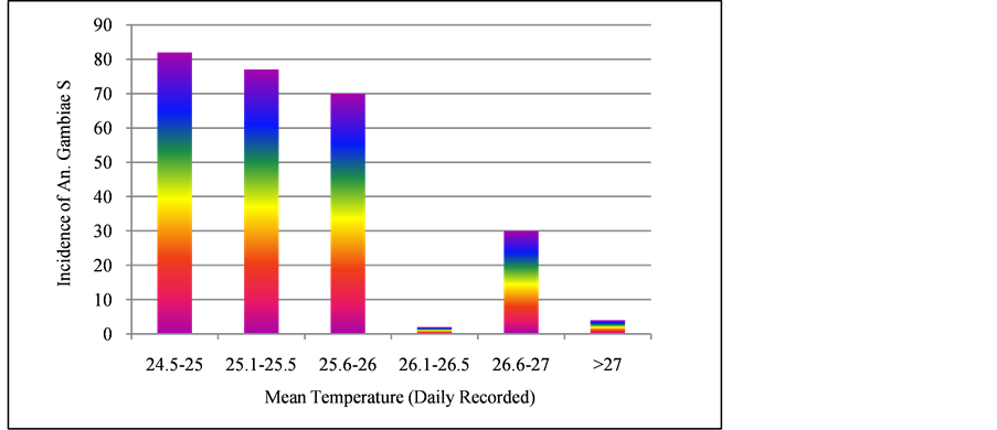 With the Anopheles gambiae S, the prevalence was highest at daily mean temperatures that ranged between 24.5˚C and 26.0˚C (Figure 5).