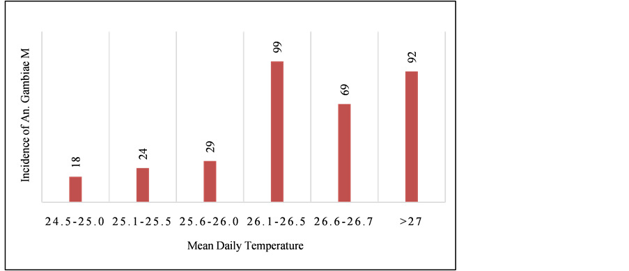 The gambiae M prevalence was found to be highest at mean daily temperatures that ranged between 26.1˚C - 27.6˚C. With the gambiae S, the prevalence was highest at daily mean temperatures that ranged between 24.5˚C and 26.0˚C (Figure 6).