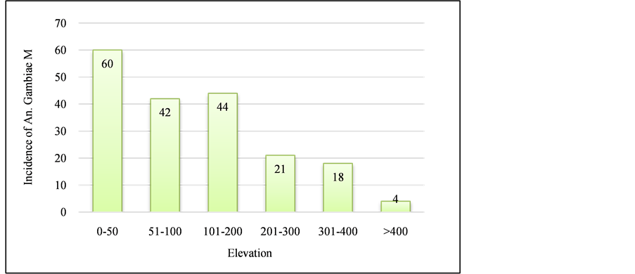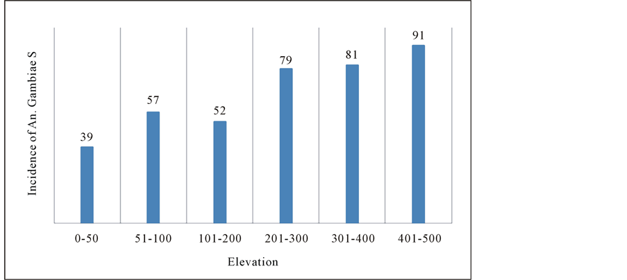 The results show that environmental factors affect the distribution of gambiae M and S. With the Anopheles gambiae S prevalence was highest at elevations between 200 m and 500 m (Figure 1).