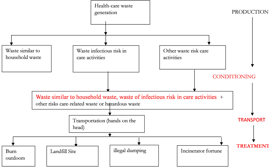 Figure 1. The summary diagram of the steps care activities waste management products in maternity wards of public hospitals in Lubumbashi.