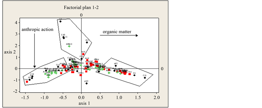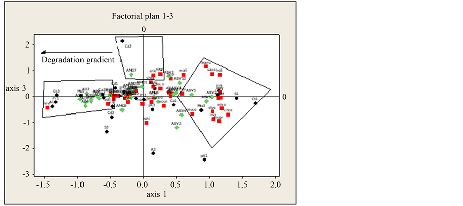 The study of factorial 1-2, 1-3 and 2-3 shows significant variations, including those of edaphic factors, are organized according to axis 1 that represents the highest contribution (0.344 for axis 1; 0.222 for axis 2 and 0.155 for axis 3).