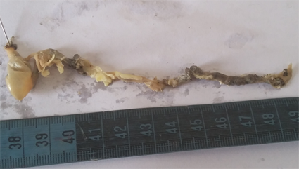 The digestive tract is formed of a thick-walled esophagus, followed by a U shaped stomach surrounded by pyloric caeca. There are an average of 8 pyloric caeca and intestine is curled (Figure 2).