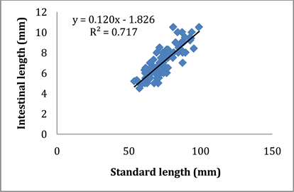 There was a significant linear relationship between the length of the intestine and the standard length of the fish (r = 0.84, p < 0.05). Intestinal coefficient of 300 individuals analyzed varies between 0.71 and 1.29 with an average of 0.95 ± 0.48 (Figure 3). The intestine of Bryconaethiops boulengeri is so short.