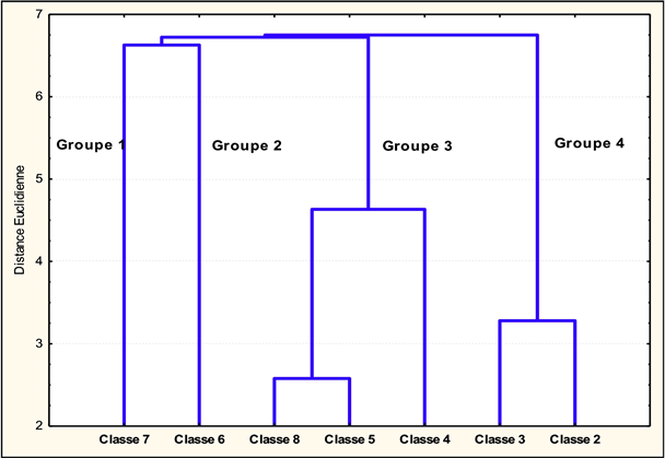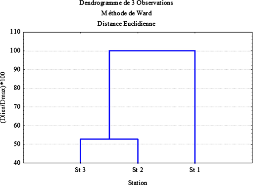 A hierarchical cluster analysis (single linkage cluster analysis) was used to highlight the similarities between trophic stations and classes size. Classes size were determined according to the rule of Sturge [12] .