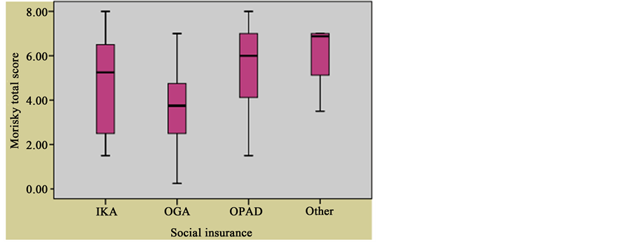 It was found that age was related to the overall score (rs = −0.421, p < 0.001), indicating that younger people were more likely to adhere to medication regimen. Gender didn’t seem to influence adherence (Mann-Whitney U = 861.5, non significant, r = −0.19). Kruskal-Wallis tests were also performed for categorical variables, followed by post hoc Mann-Whitney tests using Bonferroni correction. It was found that there were differences between various groups of participants according to marital status (H = 12.327, p = 0.006), number of children (H = 9.184, p = 0.05), level of education (H = 12.092, p = 0.007), and insurance coverage (H = 11.243, p = 0.01), but not according to income (H = 9.221, p = 0.101). Further, it was noted that married participants had higher adherence scores versus widowers (U = 373.5, p = 0.009, r = −0.29), people who didn’t have any children also had higher adherence scores versus participants with 3 or more children (U = 45.00, p = 0.0011, r = −0.365 and U = 10.00, p = 0.001, r = −0.60, respectively), primary school graduates scored less than higher education graduates (U = 166.500, p < 0.001, r = 0.423) and participants who were insured by Agricultural Insurance Organization (OGA) had lower adherence score, compared to people insured by Welfare Organization of Public Servants (OPAD) (U = 146.00, p = 0.009, r = 0.325). Representation of relevant data is shown as boxplots in Figures 1-4.
