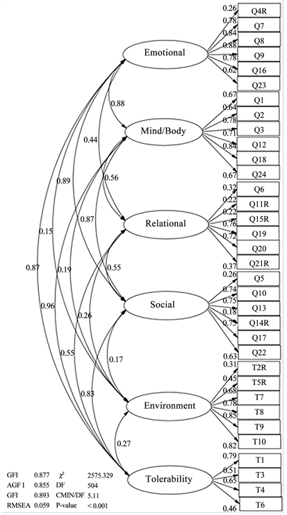 The results of both principal component analysis and CFA indicated the appropriateness of the six-factor structure. The principal component loading of all the 34 items in the six subscale structure ranged from 0.33 to 0.83. This range did not exceed the recommended value of 0.40 in the two subscales. Nevertheless, this range was considered acceptable from our judgment.