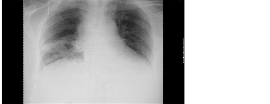 Figure 1. Chest radiograph showed increased cardiothoracic ratio (>0.5), mediastinal widening, hypotransparent opacity in the middle right pulmonary lobe with dimensions of 41 × 28 mm and elevation of the right diaphragmatic dome.