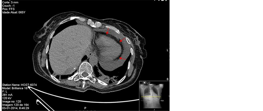 A 65-year-old caucasian woman, independent in her daily life activities, was admitted in our Internal Medicine Ward with hypercapnic respiratory failure requiring non-invasive ventilation. This patient presented a past medical history of type B2 cortical thymoma with pleural and pulmonary dissemination diagnosed in 2007, not amenable to complete resection, followed by Thoracic Surgery. The chemotherapy performed (8 cycles) had low chemosensitivity and provoked severe toxicity. A diagnosis of parathymic syndrome with myasthenia gravis was confirmed in 2012 and mestinon® therapy was initiated. The latest follow-up computed tomography scans (ten months before the current hospital admission) showed an increased cardiothoracic ratio with scarce pericardial effusion. Physical examination revealed dyspnoea at rest, blood pressure 105/62 mmHg, tachycardia (112 beats/min), with soft heart sounds, but no murmurs or friction rub were auscultated. The neck veins were not distended. Laboratory findings identified increased inflammatory parameters (leukocytosis 12760 × 106 L, neu-